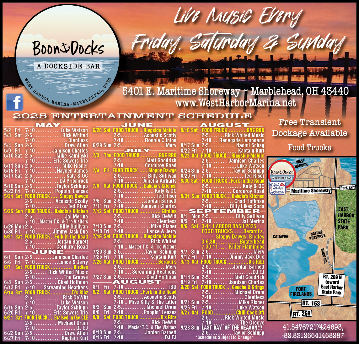 BOONDOCKS is a small dockside/poolside bar adjacent to the rental building. It is family friendly and for customers to enjoy the views overlooking the harbor. Open weekends only in May, everyday Memorial Day through Labor Day and weekends only in September. It is only open weather permitting with hours 10:00am -11:00pm. There is live music on the weekends during the daytime/evening hours (generally no later than 11:00pm). During your stay at the rentals, you may hear the music but we do not anticipate that it will be a disturbance to the rentals. However, certain evenings may be louder than others.